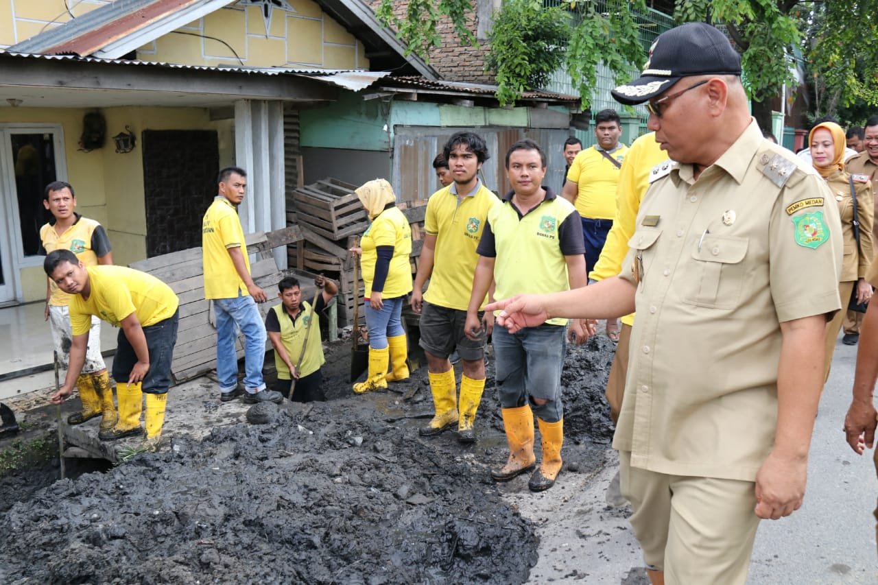 Mengenakan setelan Pakaian Dinas Harian (PDH) berwarna Khaki dan sepatu boot, Pelaksana Tugas (Plt) Wali Kota Medan Ir. H. Akhyar Nasution, M.Si memimpin pelaksanaan normalisasi parit disekitar Jalan Letda Sudjono Medan, Senin (2/12). Puluhan personil dari Dinas Pekerjaan Umum (PU) bekerja mengembalikan fungsi parit sebagai drainase.