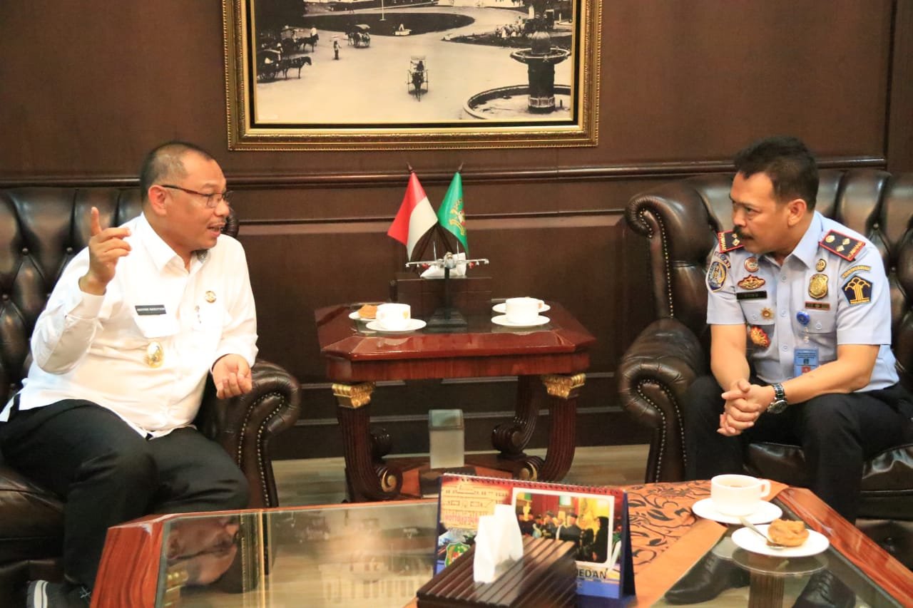Pelaksana tugas (Plt) Wali Kota Medan Ir H Akhyar Nasution MSi menerima kunjungan Kepala Kantor Imigrasi Kelas I Khusus Tempat Pemeriksaan Imigrasi (TPI) Medan Supartono SH MH dan Kepala Imigrasi Kelas I TPI Polonia Samuel Toba di Balai Kota Medan, Kamis (6/2). Selain bersilaturahmi dan memperkenalkan diri, keduanya juga sangat mengharapkan dukungan sehingga mereka dapat memberikan layanan keimigrasian dengan sebaik-baiknya sehingga memuaskan masyarakat.