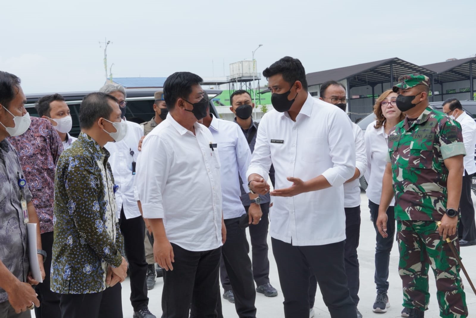 Bersama Menteri Agraria dan Tata Ruang/Kepala Badan Pertanahan Nasional (ATR/BPN) Hadi Tjahjanto, Wali Kota Medan Bobby Nasution meninjau revitalisasi Terminal Tipe A Amplas di Jalan Panglima Denai, Kelurahan Timbang Deli, Kecamatan Medan Amplas, Selasa (12/7) sore. Selain ingin melihat sejauh mana realisasi revitalisasi terminal modern di Kota Medan itu dilakukan, tujuan kunjungan dilakukan juga guna menindaklanjuti proses hibah lahan sehingga tidak ada lagi masalah terhadap lahan terminal tersebut.