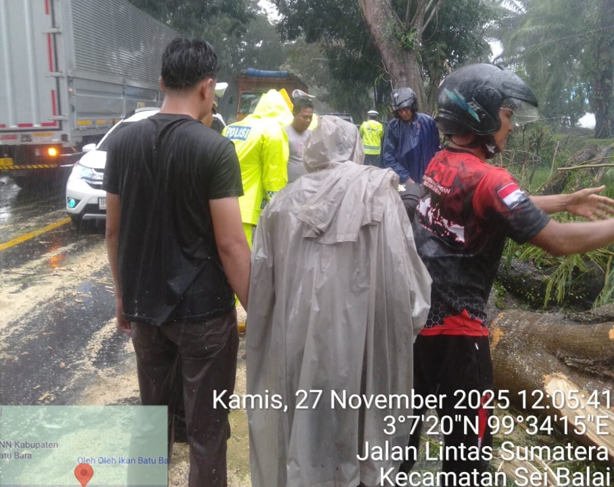 Inimedan.com-Batu Bara | Respons cepat pemerintah melalui Badan Penanggulangan Bencana Daerah (BPBD) Kabupaten Batu Bara bersama Dinas Perkim LH dan Satlantas Polres Batu Bara ditunjukkan dalam penanganan bencana pohon tumbang yang terjadi di beberapa wilayah Kabupaten Batu Bara, Kamis (27/11/2025).