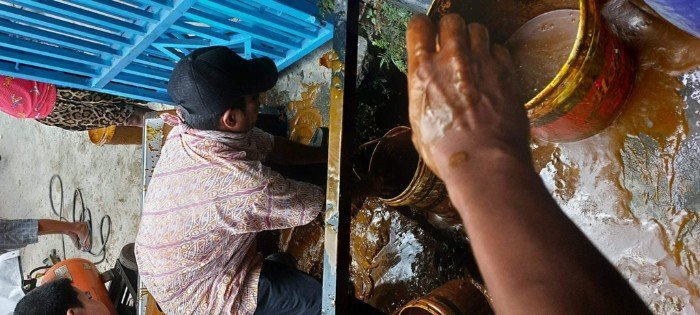 Warga berdatangan ke lokasi dan mengambil tumpahan CPO yang menyemburkan muatan minyak nabati kelapa sawit dari dalam tangki berukuran 19 ton.