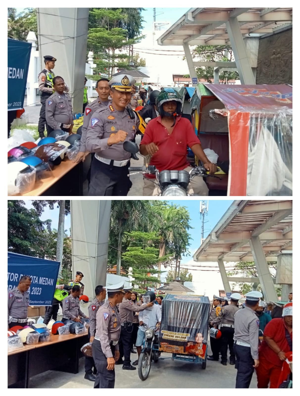Direktorat Lalu Lintas (Ditlantas) Polda Sumut membagikan 200 helm Standar Nasional Indonesia (SNI) kepada para abang beca bermotor (betor) yang beroperasi di kota Medan khususnya, Senin (11/9) siang.