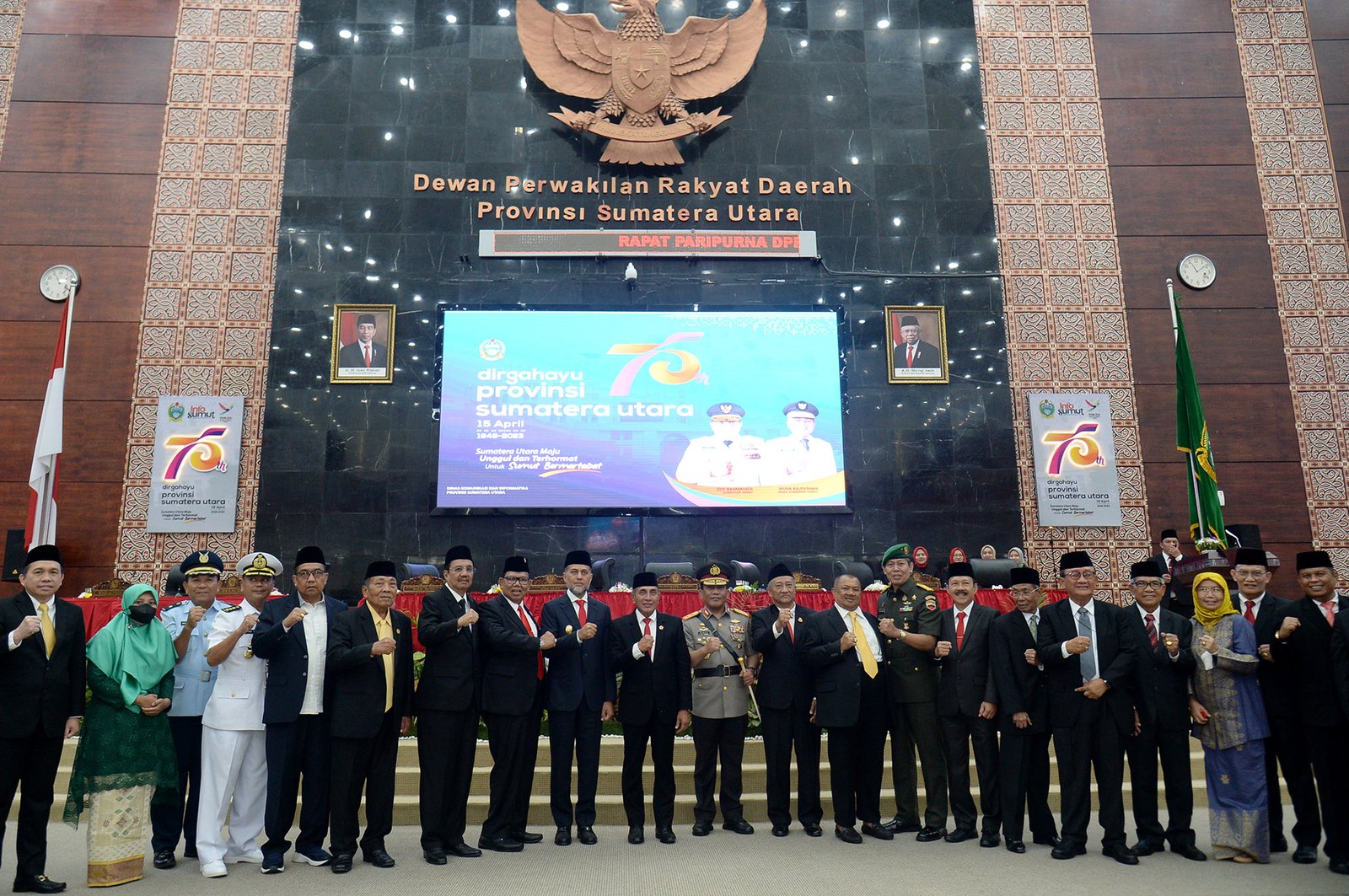 Pada momentum peringatan hari jadi Provinsi Sumut itu, juga digelar penyerahan pengharaan kepada para tokoh Gubernur, Sekdaprov dan Ketua DPRD terdahulu yang diundang hadir para paripurna tersebut. Selanjutnya seluruh pimpinan dewan dan para tokoh serta anggota DPRD Sumut berfoto bersama dalam momentu peringatan Hari Jadi ke 75 Provinsi Sumut.*di#