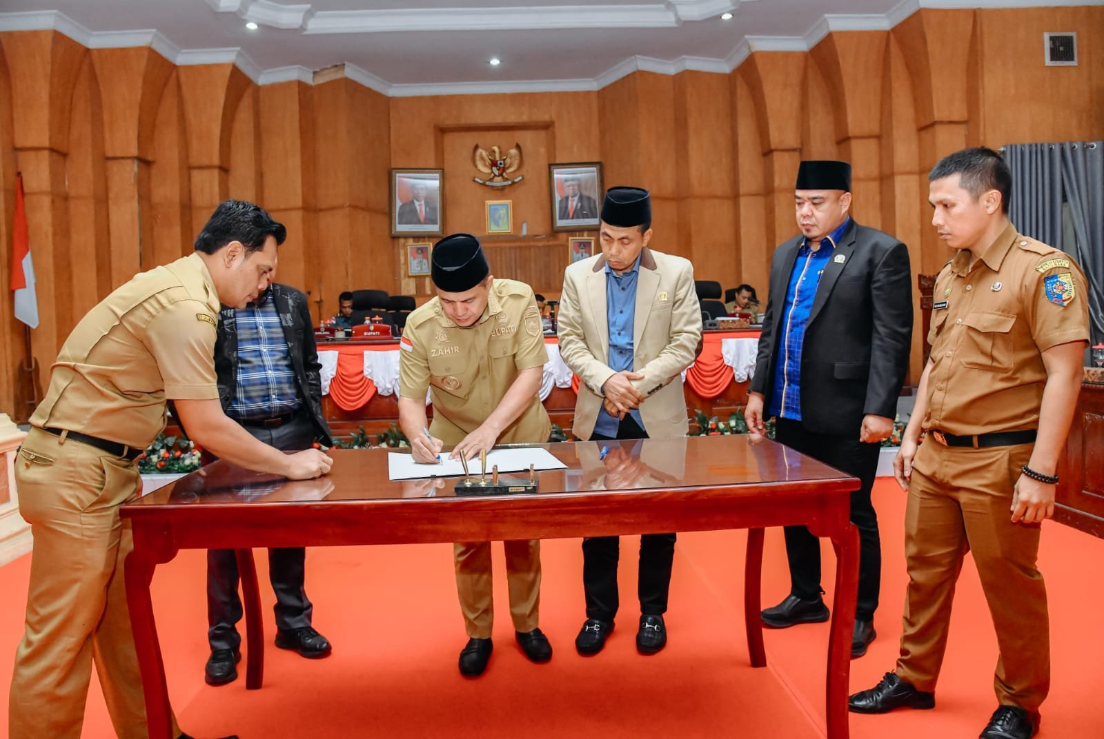 Setelah dinyatakan setuju, Bupati Zahir bersama Ketua DPRD Batu Bara M. Safi’i menandatangani nota kesepakatan dan persetujuan bersama dan kemudian menetapkan Ranperda P-APBD tahun 2023 menjadi Peraturan Daerah (Perda).