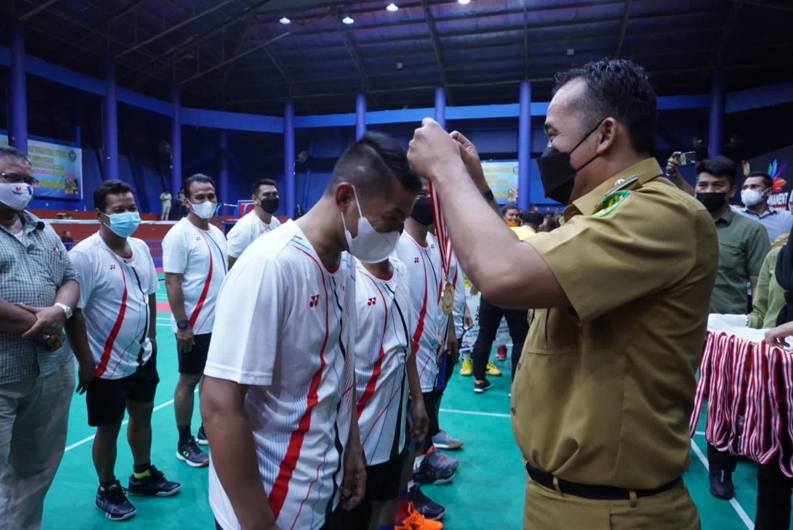 Setelah berlangsung selama enam hari, Wali Kota Medan Bobby Nasution diwakili Wakil Wali Kota Medan H Aulia Rachman menutup Turnamen Badminton Perusahaan Umum Daerah (PUD) Pasar Kota Medan Berkolaborasi di Gedung PBSI Jalan PBSI/Pancing, Deliserdang, Selasa (18/1). Tuan rumah sekaligus penyelenggara turnamen, PUD Pasar keluar sebagai juara umum kejuaraan adu smash tersebut.