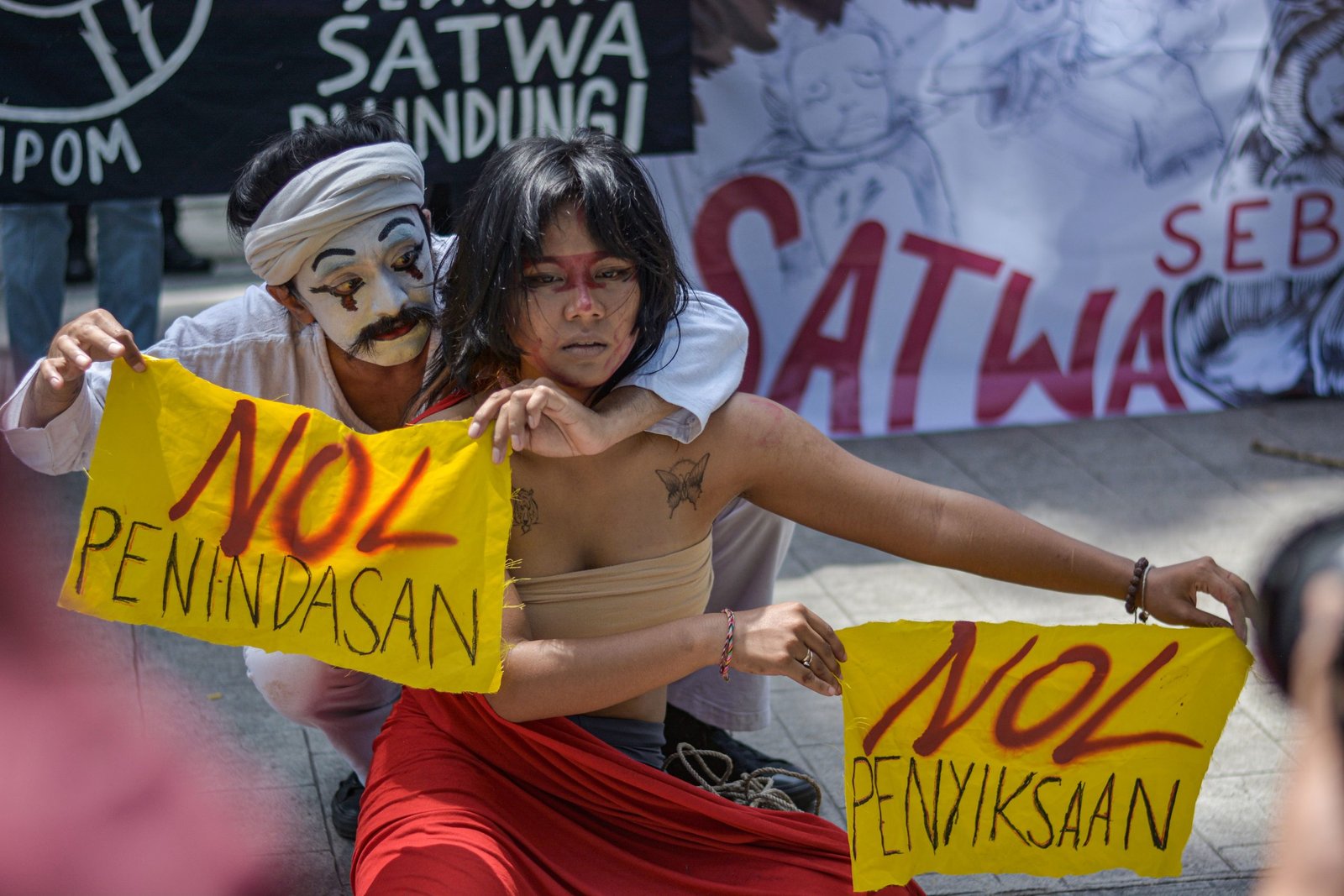 Bersama Menteri LHK Siti Nurbaya Bakar serta sejumlah influencer yang terkenal dengan konten satwa liar, kawanan ini berdiri sambil memegang poster tentang kekejaman yang selama ini mereka hadapi. Namun alih-alih menteri dan influencer sungguhan, mereka adalah relawan dengan topeng kertas, anggota Koalisi Primates Fight Back—gabungan dari berbagai organisasi pelindung satwa, seniman, juga komunitas konservasi di Indonesia.