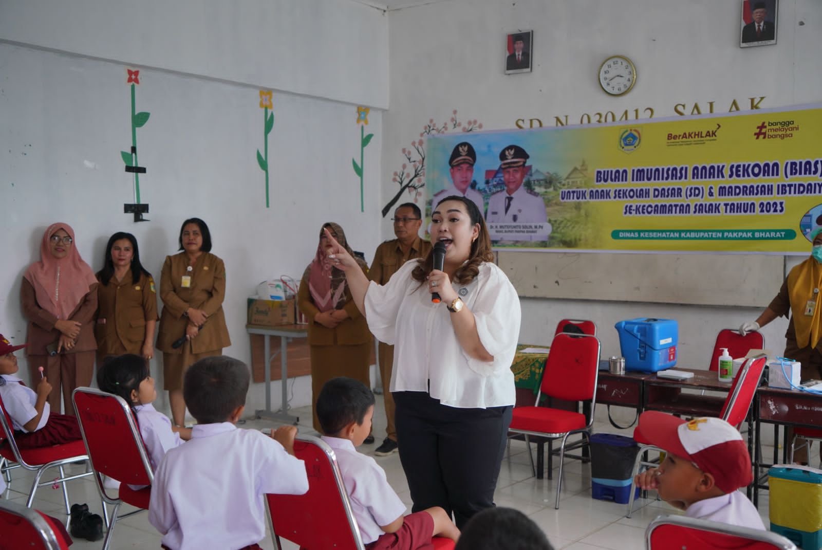 Ketua TP PKK Pakpak Bharat, Ny. Juniatry Franc Bernhard Tumanggor mengunjungi SD N 030412, Salak guna menghadiri Pencanangan Pelaksanaan Bulan Imunisasi Anak Sekolah (BIAS) dan Human Papiloma Virus (HPV) Kabupaten Pakpak Bharat yang diselenggarakan oleh Dinas Kesehatan Kabupaten Pakpak Bharat dan UPT Puskesmas Salak pada Senin, (15/08).