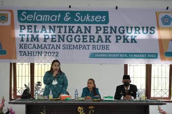 Seluruh pengurus dan anggota PKK hendaklah menjadi garda terdepan dalam upaya ini, mewujudkan keluarga sejahtera, berkualitas dalam berbagai aspek, diantaranya aspek moral, pendidikan, kesehatan, sosial ekonomi, dan lingkungan hidup terutama di wilayah kerja masing-masing, ucap Ny. Juniatry saat melantik pengurus TP PKK Kecamatan siempat Rube di Aula Kantor Camat (18/03/2022).