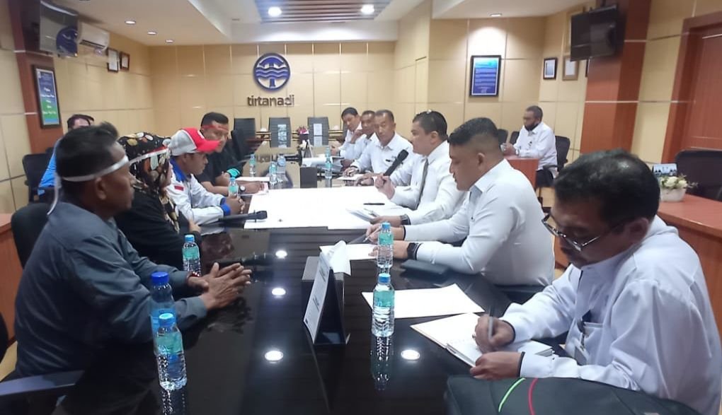 Puluhan masyarakat Belawan dan Sicanang mendatangi Kantor Perumda Tirtanadi dengan melakukan aksi damai di Kantor Perumda Tirtanadi Jl SM Raja Medan Senin (16/10/2023).