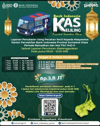Kemudian di 26 – 27 April 2022 layanan penukaran uang baru tersebut dapat dilakukan di halaman depan Gedung Heritage KPw BI Provinsi Sumut mulai pukul 09.00-12.00 WIB. Sedangkan pada 27 April 2022, layanan penukaran uang baru digelar di Komplek BI Jalan Elang, Kota Medan, Provinsi Sumatera Utara (Sumut) mulai pukul 09.00 – 12.00 WIB.