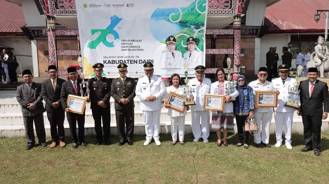 Penyerahan penghargaan dilaksanakan usai memperingati Hari Kesaktian Pancasila yang jatuh bersamaan dengan peringatan HUT Kabupaten Dairi ke-76, digelar di depan Kantor Bupati, di Sidikalang, Minggu (1/10).