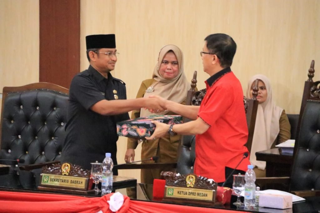 Pemko Medan menerima surat putusan salinan hasil pokok-pokok pikiran anggota DPRD Medan dalam Rapat Paripurna Penyampaian Pokok-Pokok Pikiran Anggota DPRD di Gedung DPRD Medan, Senin (9/3/2020). Tujuannya sebagai bahan rujukan dan masukan bagi Pemko Medan dalam menjalankan rencana kerja pemerintah daerah (RKPD) agar memberikan hasil yang optimal.