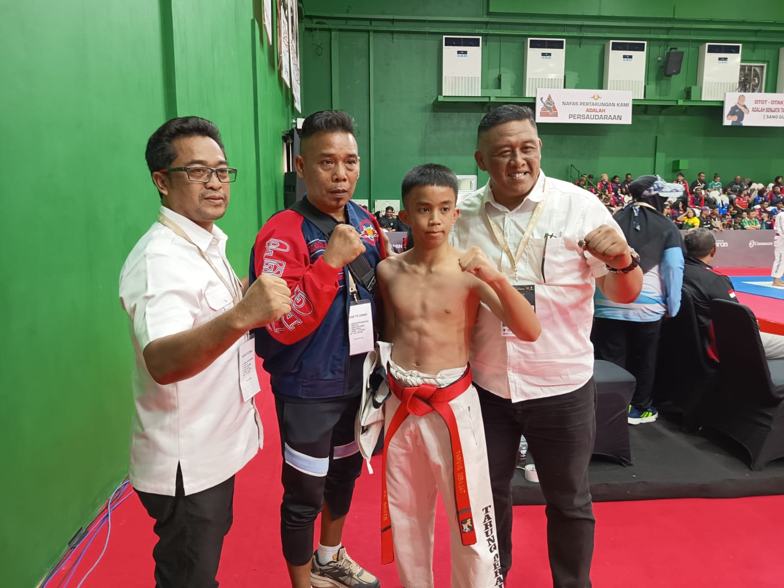 Caption Poto: Wakil Ketua I KONI Sumut Bambang Kencono Wahono (kanan) dan Wakil Ketua II Prof Indra Kasih (kiri) berpoto bersama Fadhel Tirta Yudha (tengah), atlet tarung Drajat yang masih berusia 14 tahun dan berhasil meraih perunggu di nomor seni gerak tunggal putra.*di#