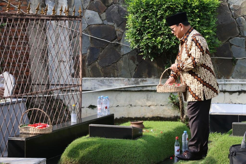 Prabowo berziarah ke makam ayahnya pada pagi hari. Ia datang seorang diri mengenakan pakaian batik dan kopiah hitam.