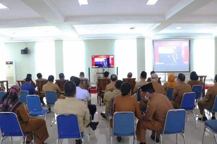 Sekretaris Daerah Kota Tebingtinggi Muhamad Dimiyathi, S.Sos, M.TP bersama Forkopimda Tebingtinggi mengikuti acara Peringatan Ke-XXVI Hari Otonomi Daerah Tahun 2022 secara virtual, Senin (25/4/2022) di Aula Balai Kota.