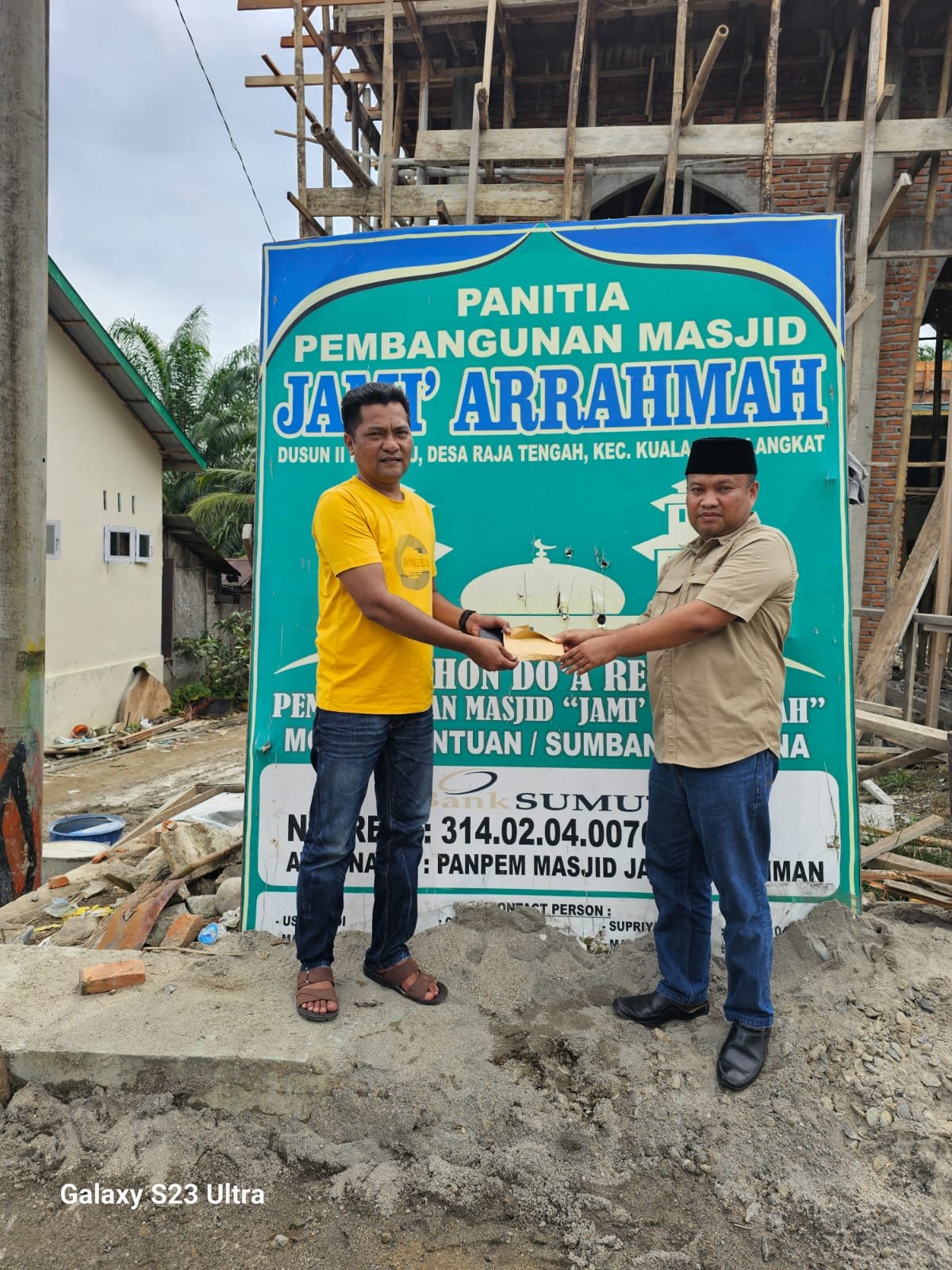 Sekretaris DPD Gerindra Sumut Sugiat Santoso memberikan bantuan untuk pembangunan Masjid Jami Ar Rahmah yang berada di Dusun II Kp Baru, Desa Raja Tengah, Kecamatan Kuala, Kabupaten Langkat.