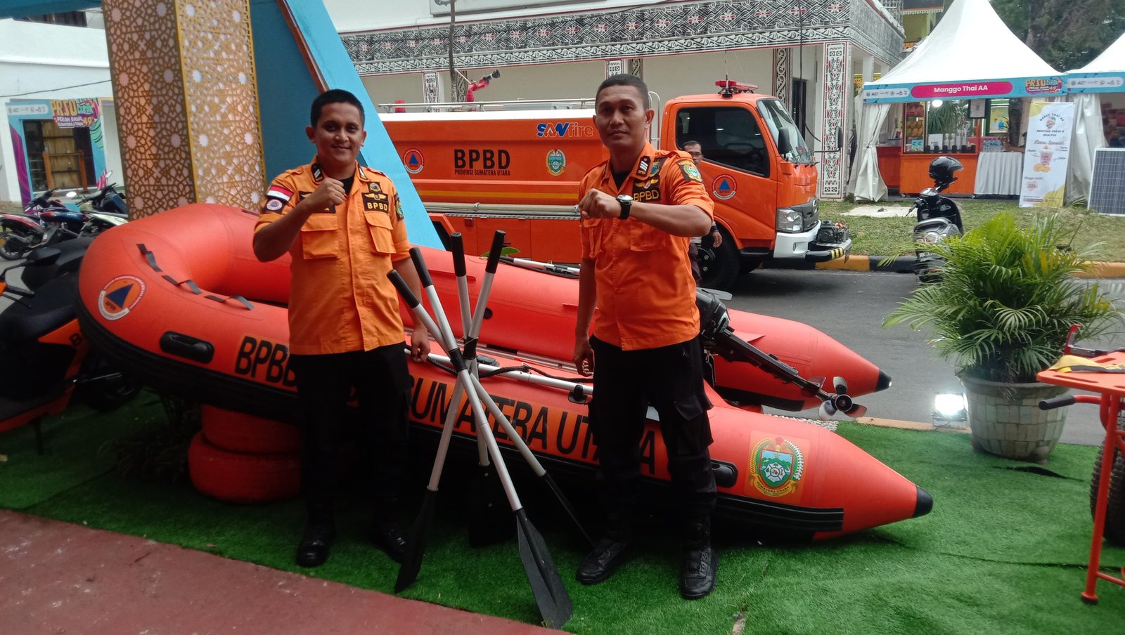 Dalam melaksanakan tugas personil dari BPBD Provinsi Sumatera Utara dilengkapi beberapa peralatan khusus. Ada perahu karet, mobil pemadam kebakaran, sepeda motor, shenso maupun baju pemadan dan beberapa peralatan lain seperti yang dipajangkan didepan stand mereka.