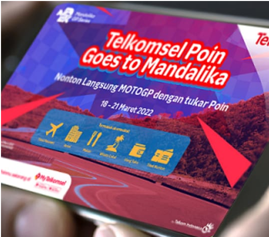 Mewujudkan komitmen dalam mendukung event olahraga tingkat internasional di Indonesia, sekaligus mendorong kebangkitan sektor pariwisata lokal di tengah masa pandemi yang masih berlangsung, Telkomsel menggelar program loyalitas Telkomsel Poin Goes to Mandalika bagi pelanggan untuk mendapatkan kesempatan menyaksikan seri MotoGP 2022 secara langsung di Mandalika. Cukup dengan menukarkan 1 Telkomsel Poin, pelanggan akan mendapatkan 1 kupon Lucky Draw Paket Perjalanan MotoGP Mandalika.