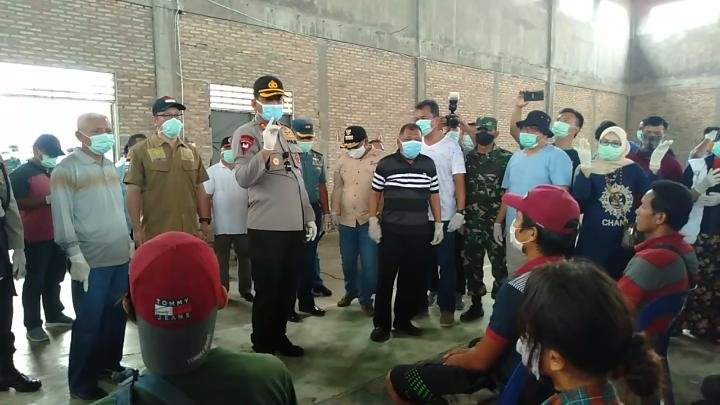 Ketua Tim  Gugus Tugas Pencegahan Covid 19 Kabupaten Asahan H Surya, Bsc bersama Ketua DPRD, Kapolres, DanLanal TB/AS, Plt, Kadis Kesehatan, Dirut RSUD HAMS lakukan pemeriksaan kesehatan terhadap 10  TKI asal Asahan yang baru kembali dari Malaysia, Minggu (5/4/2020)