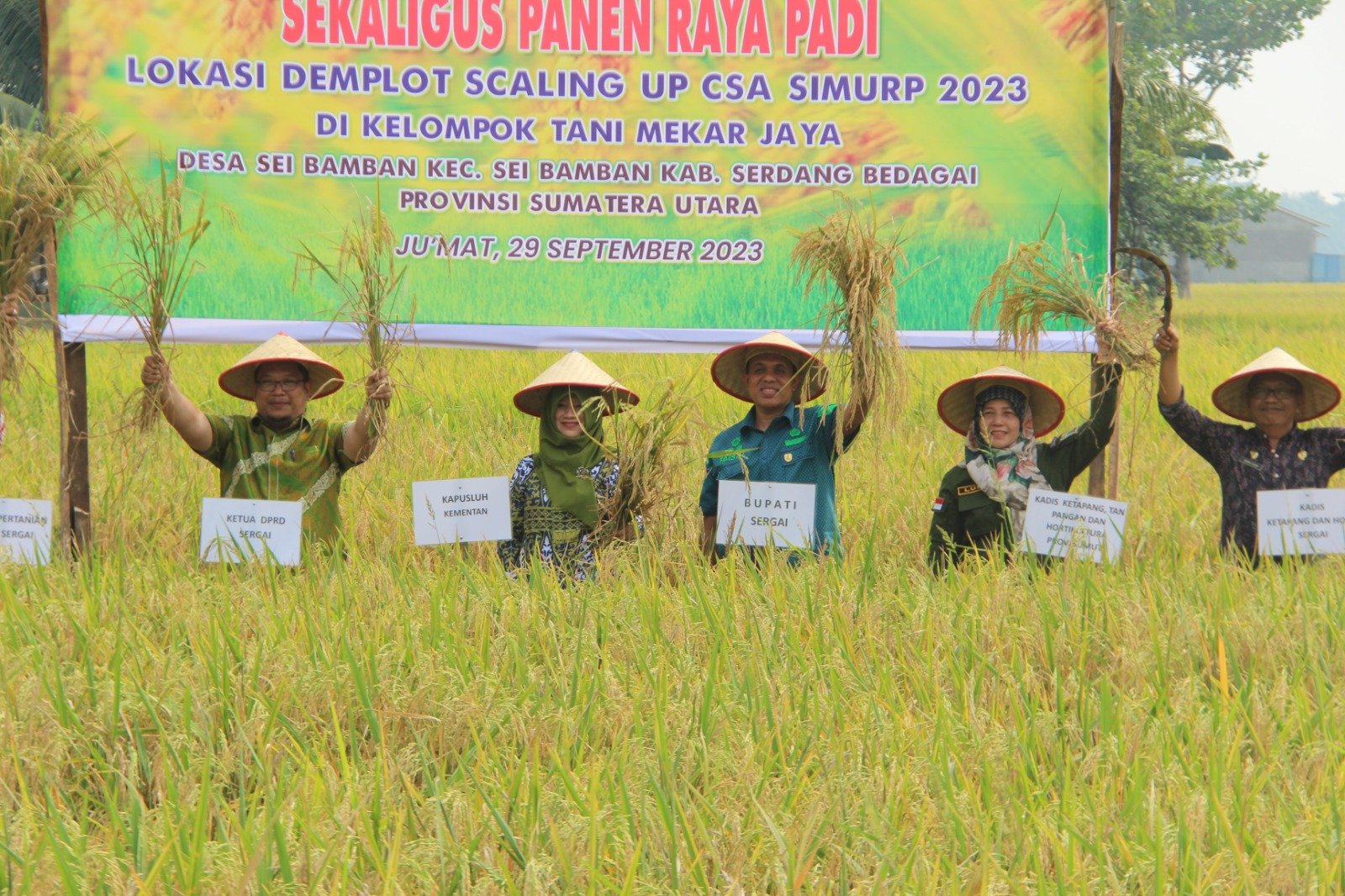 Bupati Serdang Bedagai (Sergai) H. Darma Wijaya melalui Sekretaris Daerah Kabupaten (Sekdakab) Sergai M. Faisal Hasrimy, AP, MAP, menghadiri kegiatan Strategic Irrigation Modernization and Urgent Rehabilitation Project (SIMURP) Farmer Field Day (FFD) Scalling Up atau Temu Lapang sekaligus Panen Raya Tanaman Padi Sawah di Kelompok Mekar Jaya, Dusun 7 Brohol, Sei Bamban, Jumat (29/9/2023).